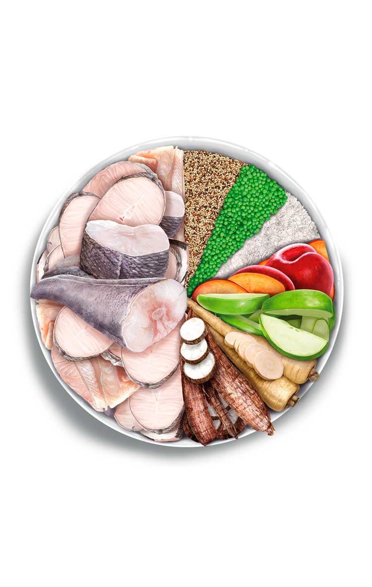 SAMENSTELLING: vers bereide witvis 61% (per 100 kg product gebruiken ze 110 kg vers bereide witvis), groene erwten, volkorenrijst, volkorengerst, aardappeleiwit, volkorenhaver, gedehydrolyseerde vis, biergist, mineralen, lijnzaad (natuurlijke bron van omega-3 vetzuren), appelvezels, visolie ( natuurlijke tocoferolen), glucosamine 1400 mg/kg, gedehydreerde pompoen, gedehydreerde broccoli, veenbessen, spirulina, kelp, gember, Antarctische krill, arracacha 1000 mg/kg, gedehydreerde pruimen 1000 mg/kg, quinoa 1000 mg/kg, methylsulfonylmethaan (MSM) 1000 mg/kg, chondroïtine 1000 mg/kg, cichorei (bron van fructo-oligosachariden (FOS)) 1000 mg/kg, gedehydreerde boerenkool, kurkuma 1000 mg/kg, gehydrolyseerde gistcelwand (bron van mannan-oligosachariden (MOS)) 1000 mg/kg, rozemarijn 250 mg/kg, yucca schidigera.