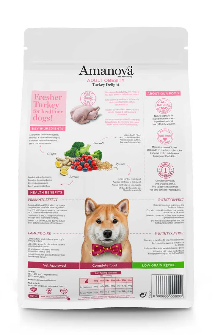 Amanova Hondenvoer Adult Obesity Turkey Delight is een vetarme voeding voor volwassen honden.  Als enige dierlijke bron is  verse kalkoen gebruikt. Voor deze bron is gekozen omdat het smakelijk vlees is dat rijk is aan eiwitten, een laag percentage vet bevat en laag is in cholesterol. Kalkoen is ook makkelijk verteerbaar mager vlees dat de spierontwikkeling bevordert.