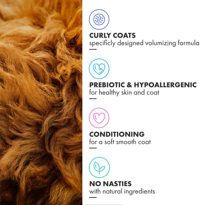 Verzorgende hondenshampoo speciaal ontwikkeld voor krul- en golvende vachten.