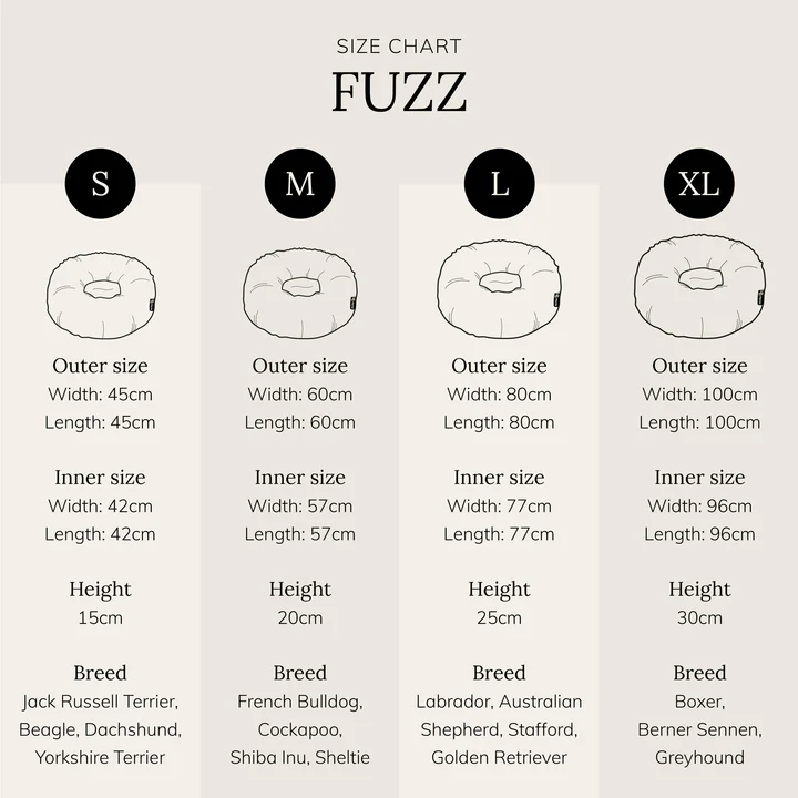 De FUZZ is leverbaar in vier verschillende maten. Maat S is geschikt voor kleine katten en kleine huisdieren die het fijn vinden om in een knus holletje te liggen. Maat M is geschikt voor grotere kattenrassen en kleine hondenrassen zoals Maltezers en Chihuahuas. Maat L biedt genoeg ruimte voor medium hondenrassen zoals Beagles, Cockers of Franse Bulldogjes, Engelse Staffords. De XL is geschikt voor grote rassen zoals Border Collie, Golden Retriever of Labrador.