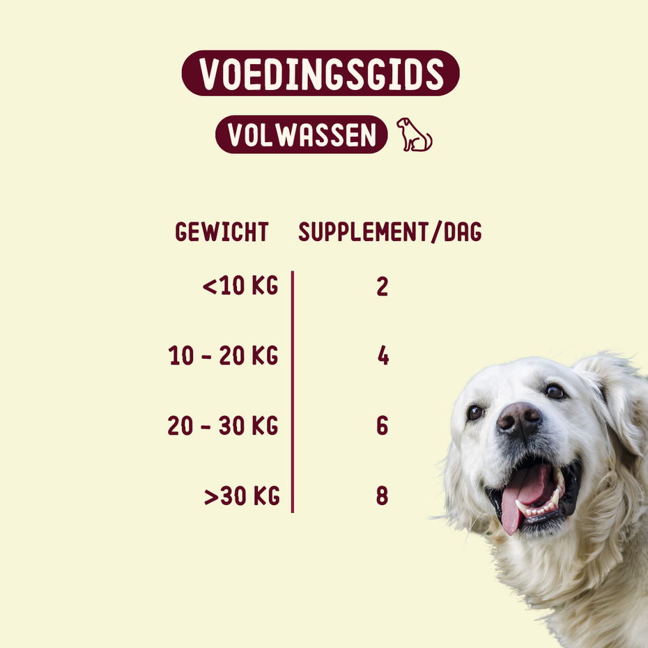 - Extra grote honden 35kg en zwaarder > 7-8 stuks / dag
