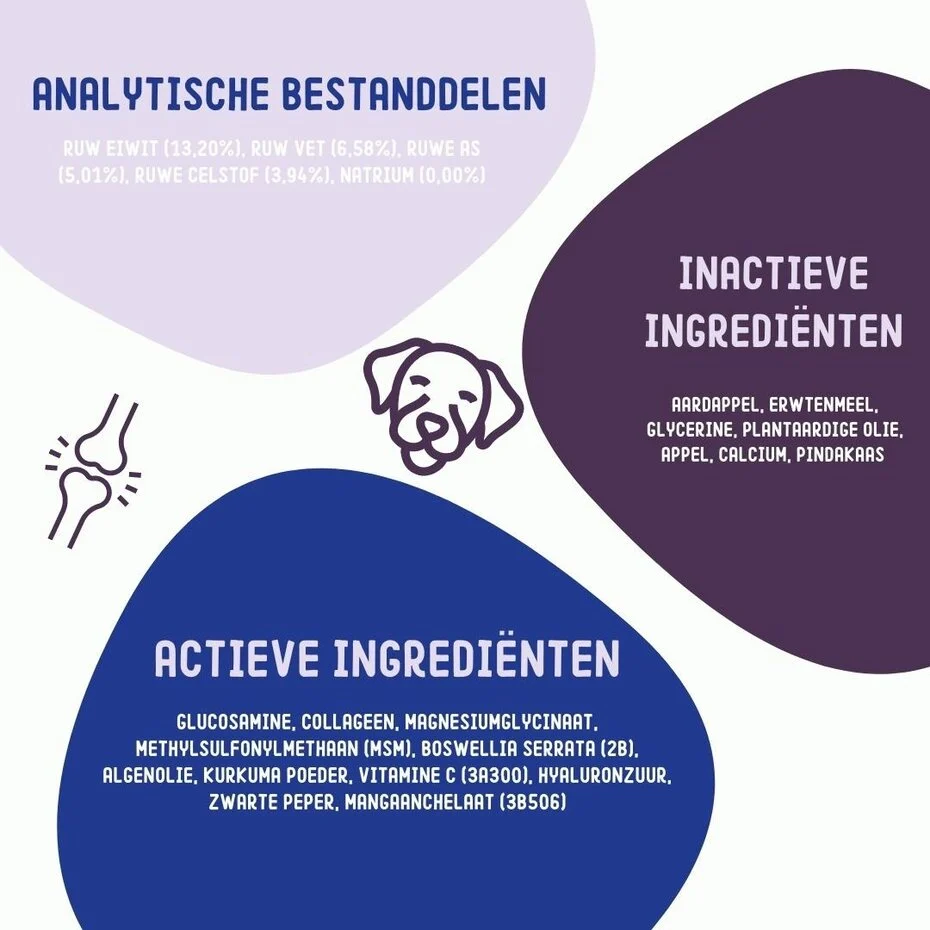 Glucosamine 240mg/chew, Collageen 159mg/chew, Magnesium glycinaat 110mg/chew, Methylsulfonylmethaan (MSM) 100mg/chew, Boswellia Serrata 75mg/chew, Algenolie 60mg/chew, Kurkuma Poeder 38mg/chew, Vitamine C 13mg/chew, Hyaluronzuur 10mg/chew, Zwarte Peper 1,1mg/chew, Mangaan-chelaat 0,9mg/chew