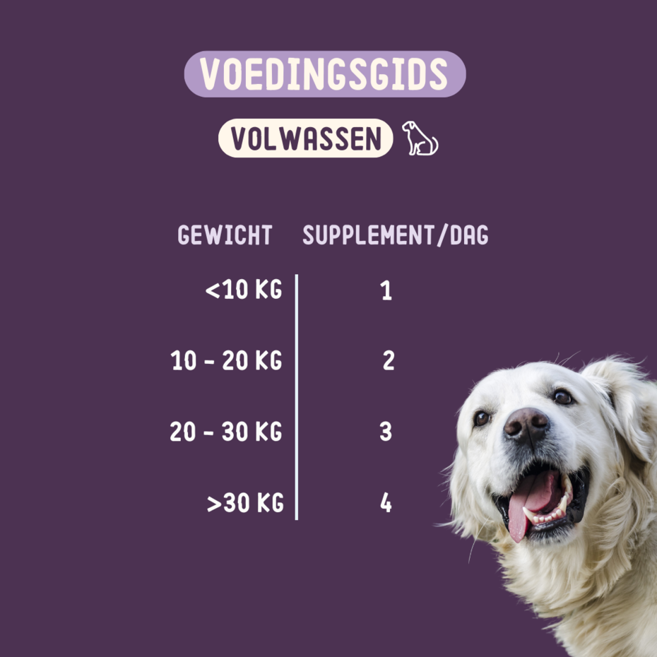 Dit supplement is samengesteld met een zorgvuldige mix van natuurlijke ingrediënten om de mobiliteit en flexibiliteit van honden te ondersteunen. Het bevat een krachtige mix van glucosamine, chondroïtine en MSM om de gezondheid van de gewrichten te bevorderen. De formule is verrijkt met omega-3 vetzuren, die bekend staan om hun ontstekingsremmende eigenschappen en helpen om gewrichtsklachten te verminderen.
