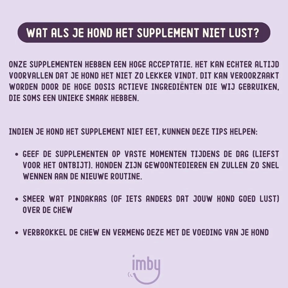 Elke Imby pot bevat 90 zachte supplementen. Heb je een kleine hond (<10 kg), dan heeft hij 1 supplement per dag nodig en de pot gaat in dat geval ongeveer 3 maanden mee. Middelgrote honden (10-20 kg) hebben 2 voedingssupplementen per dag nodig, waardoor je na 1,5 maanden een nieuwe pot nodig hebt. Grote honden (20-30 kg) hebben 3 chews per dag nodig en een pot is dan voldoende voor 1 maand.