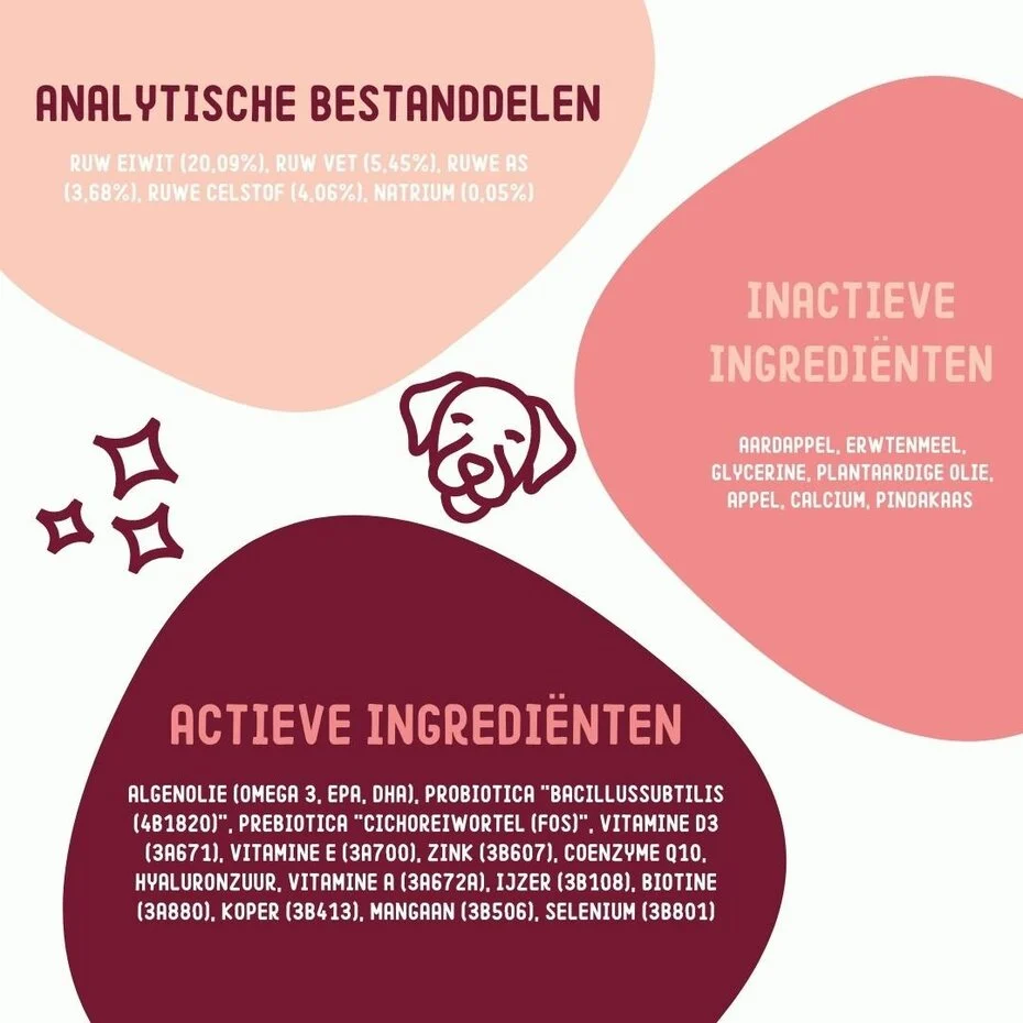 Algenolie 120 mg/chew , Probiotica: Bacillus Subtilis 1 x 10^9 CFU , Prebiotica: Cichoreiwortel 89 mg/chew, Vitamine D3 76 mg/chew, Vitamine E 23 mg/chew, Zink 11 mg/chew, Co-enzym Q10 10 mg/chew, Hyaluronzuur 10 mg/chew, Vitamine A 3.750 IE , IJzer 6 mg/chew, Biotine 5 mg/chew, Koper 1,1 mg/chew, Mangaan 0,9 mg/chew, Selenium 0.04 mg/chew