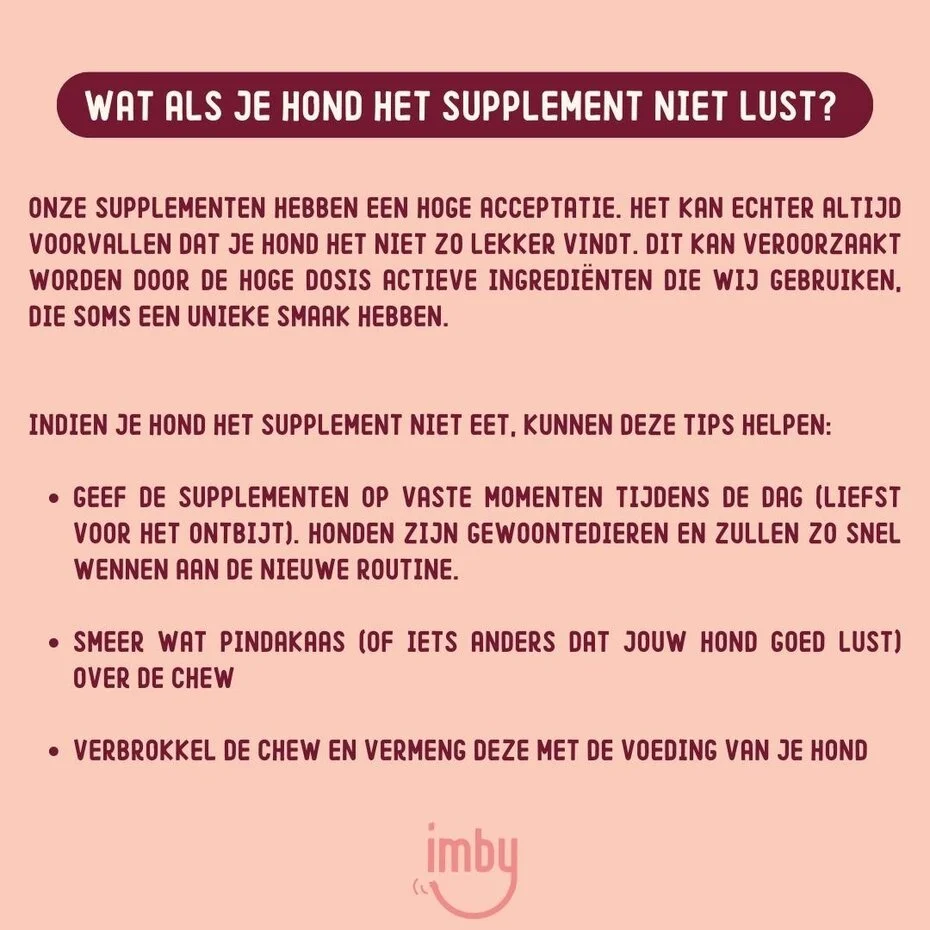 Elke Imby pot bevat 90 zachte supplementen. Heb je een kleine hond (<10 kg), dan heeft hij 1 supplement per dag nodig en de pot gaat in dat geval ongeveer 3 maanden mee. Middelgrote honden (10-20 kg) hebben 2 voedingssupplementen per dag nodig, waardoor je na 1,5 maanden een nieuwe pot nodig hebt. Grote honden (20-30 kg) hebben 3 chews per dag nodig en een pot is dan voldoende voor 1 maand.
