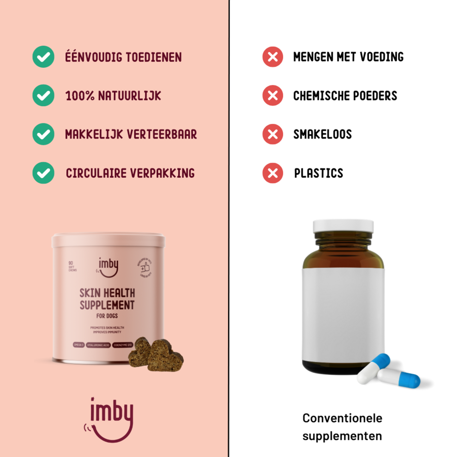Imby Skin Health Supplement is zorgvuldig samengesteld om te voldoen aan de specifieke behoeften van de huid en vacht van huisdieren, zodat ze er niet alleen goed uitzien, maar zich ook goed voelen. Een gezonde vacht is een weerspiegeling van het algehele welzijn en daarom heeft Imby dit assortiment zorgvuldig samengesteld met hoogwaardige, natuurlijke ingrediënten.
